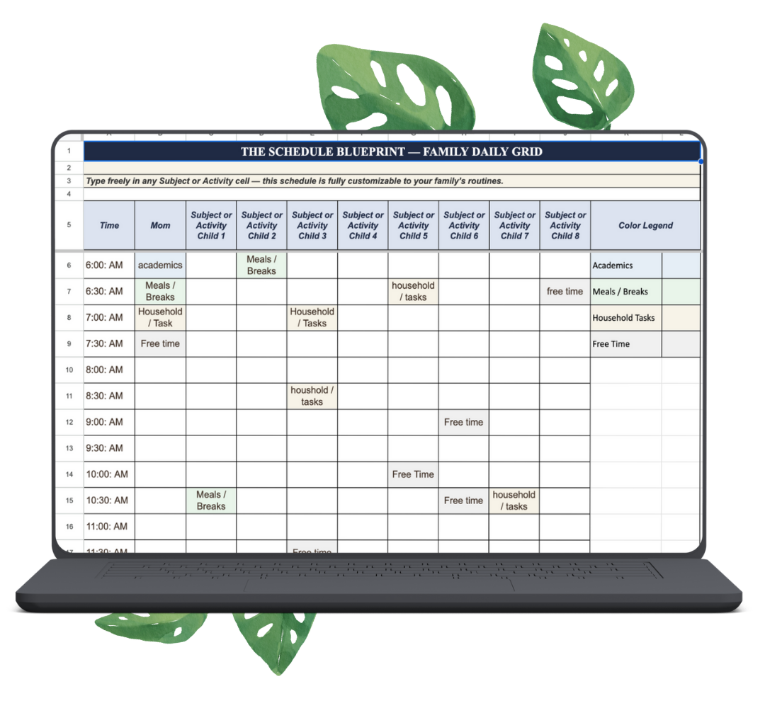 Then you've been using the wrong schedules. Most homeschool schedules fail because they're either (1) too rigid and fall apart the first time life happens, or (2) too vague and give you zero structure. The Blueprint solves both problems with the Sanity Buffer Formula—you build in flex time so the schedule survives reality.