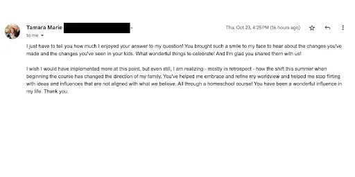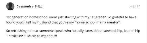 Your voice has been a blessing in our lives. My son (12) told me last week he finds school clear and manageable even though it is still challenging. Yesterday I had to go to the vet, but the children were still able to do our non-negotiables + science independently because they were clearly defined.